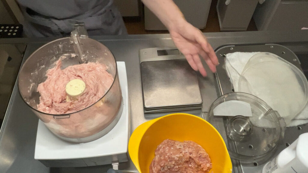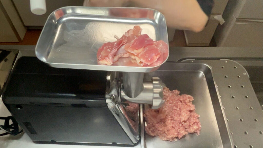 (豚肉だと絞り出すのが大変で2人がかりでやるか、ミンサーの絞り出し機能を使ってやっていました。)