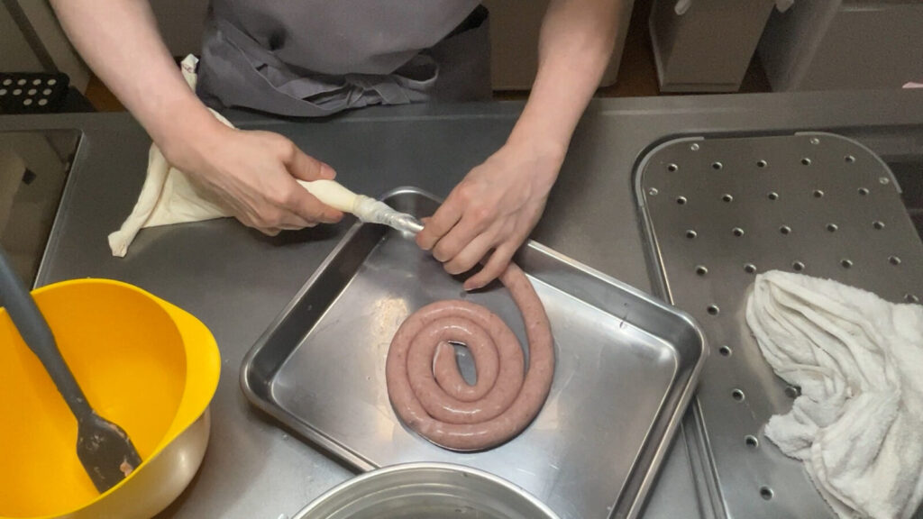 絞り出したソーセージを真ん中でねじり、あとは好みの長さでソーセージを2本まとめてねじって間を通していく。