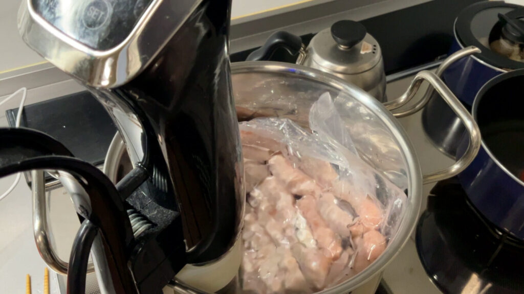 ソーセージが出来たら低温調理器で65℃、30分調理する。