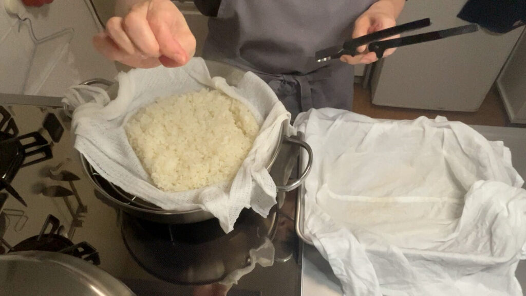 私が蒸したお米が、本来はもっとみずみずしいものだと思っていたので、ここで布巾を濡らして種切(麹菌を撒く作業)してみたらどうか。