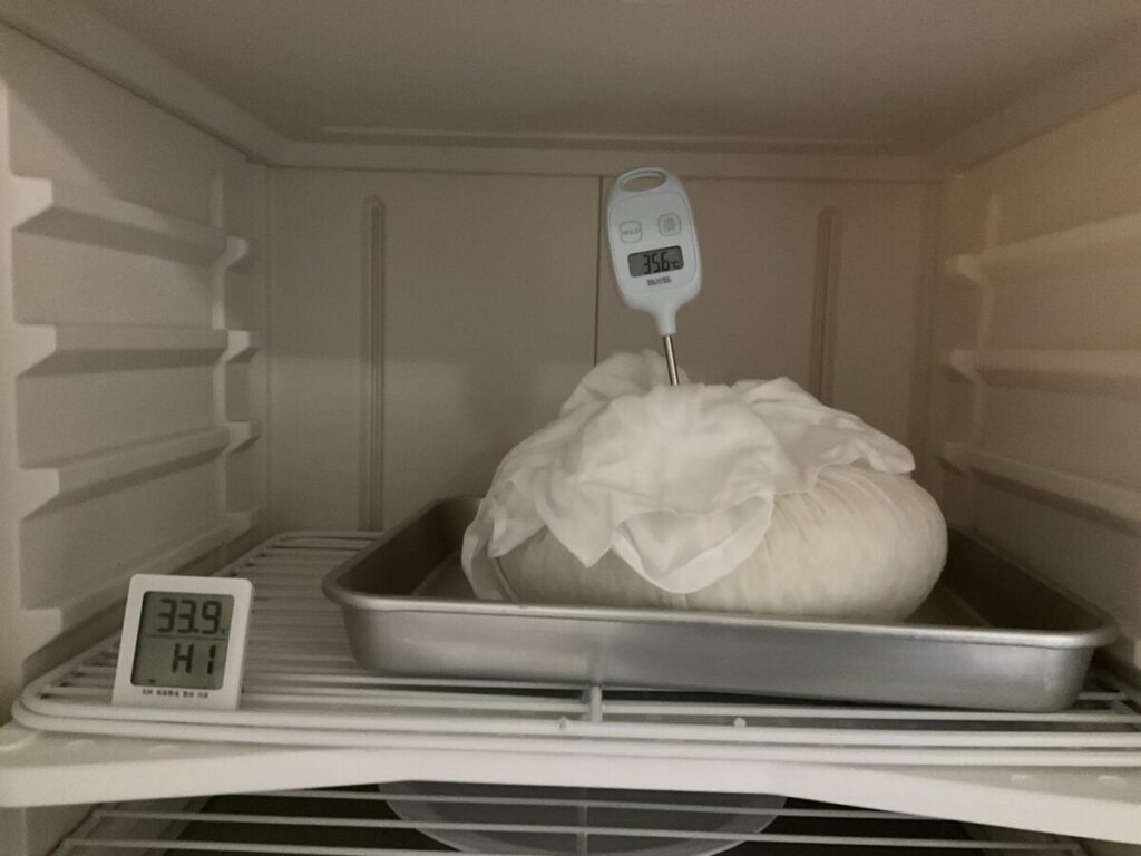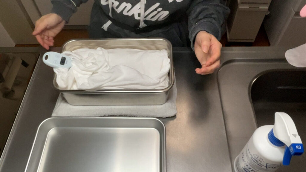 そこで、バットの底に濡らした布巾を敷き、温度が36℃台になるくらいまで様子を見て、発酵器へ戻しました。