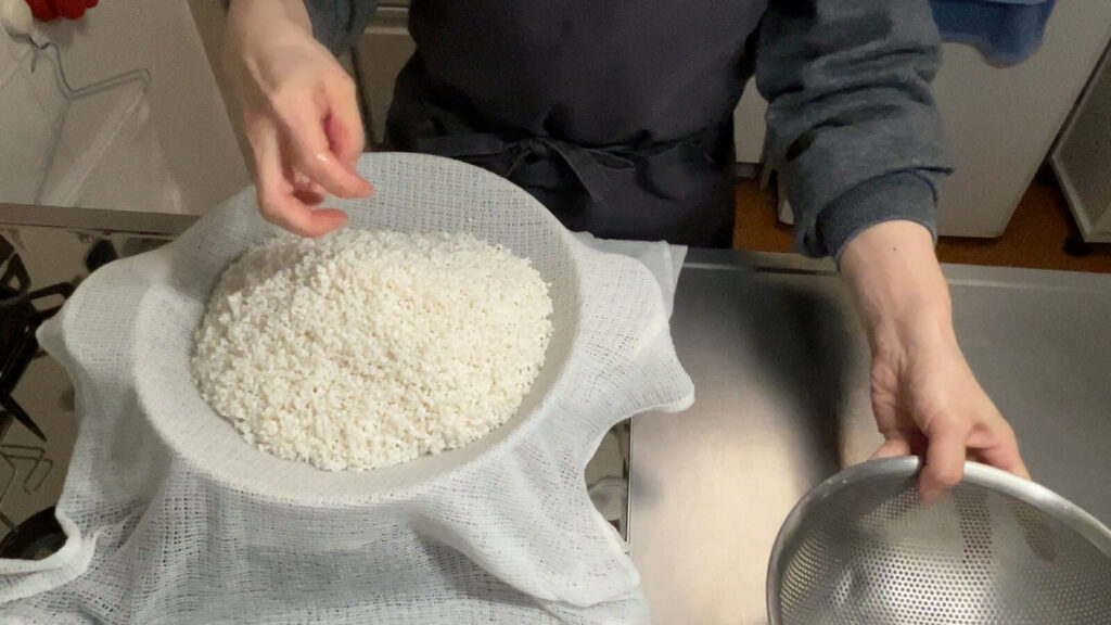 うちではこのバットが一番大きなサイズなんですが、いっぱいいっぱいで、冷ますにも麹菌を振って混ぜるのもこぼれそうになりました。