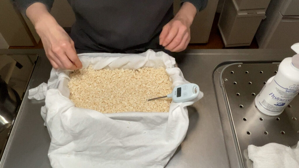 そうすることで、麹菌を振った後の最初の発酵や中仕事でも長時間38℃前後を保つことができました。