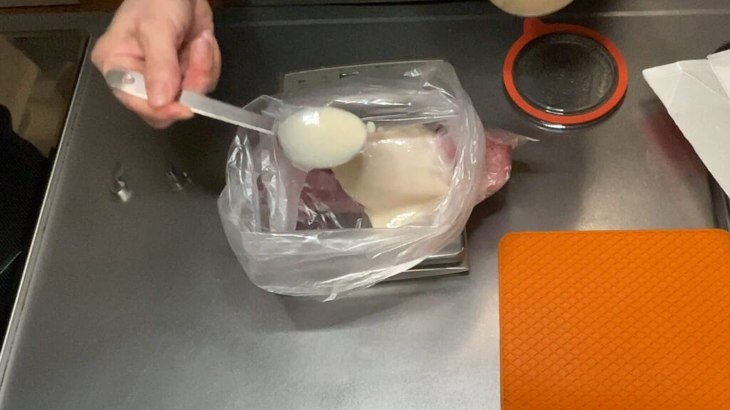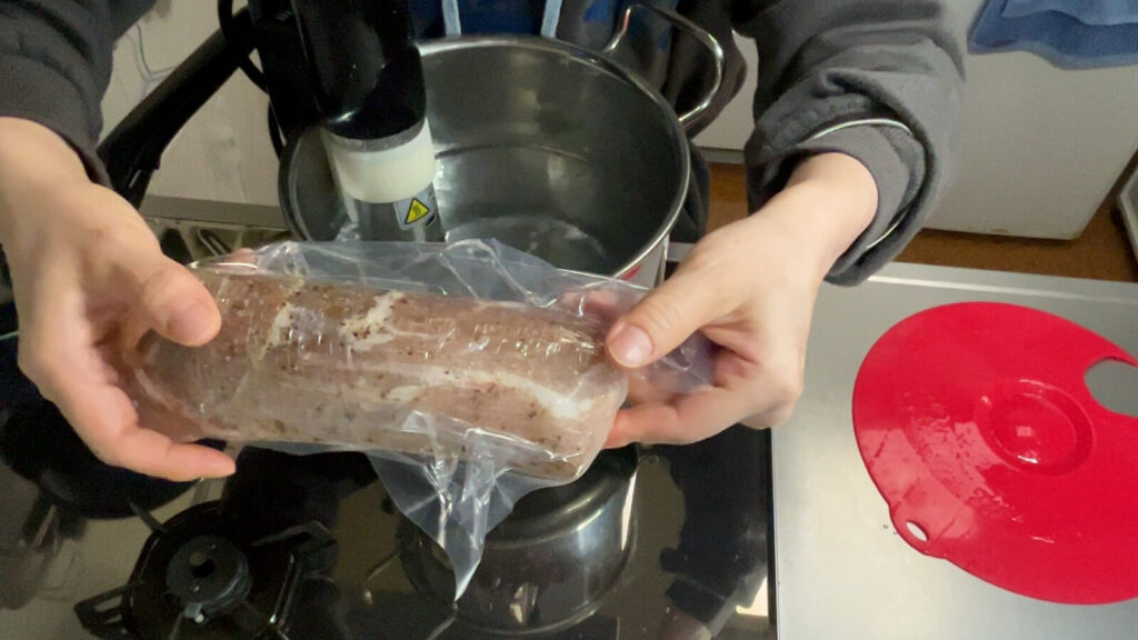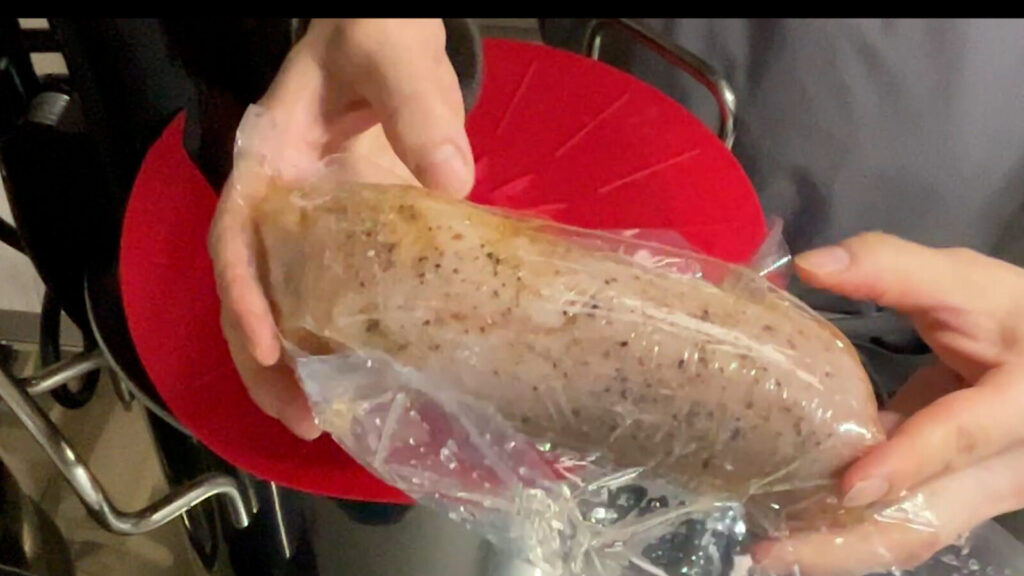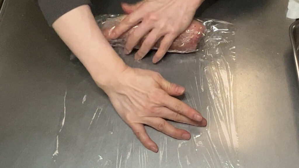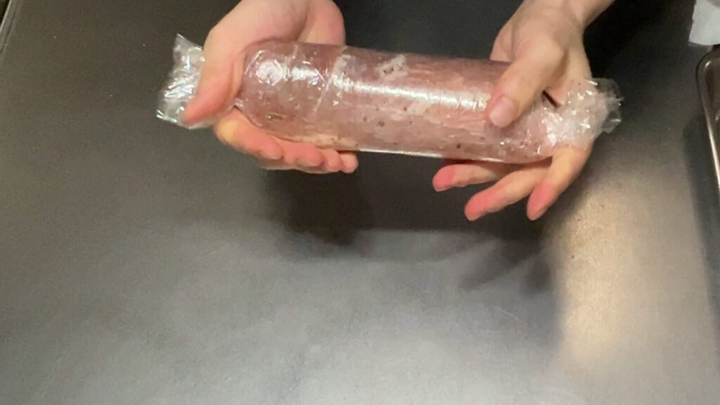 そのまま真空パックでもよかったんですが、ラップでぐるぐる巻きにして、丸く成形しました。