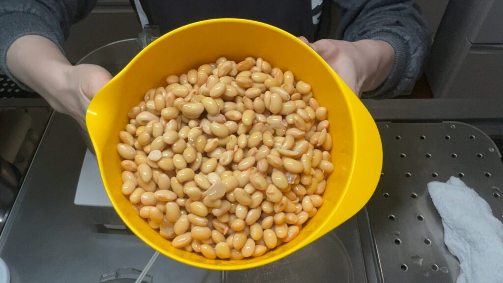 大豆は鍋でコトコト長時間茹でる方法と圧力鍋で茹でる方法がありますが、今回は3回に分けて圧力鍋で煮ました。